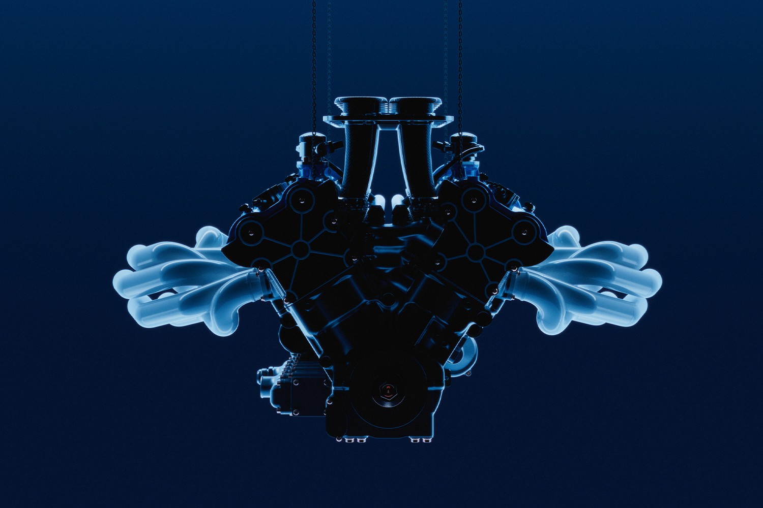The crankcase is machined from solid billet aluminium for rigidity and weight control. The carbon intake system, supported by billet structures, is engineered as much for sound character as airflow efficiency. Forged connecting rods, ultra-light pistons, high compression ratios and immediate throttle response.
